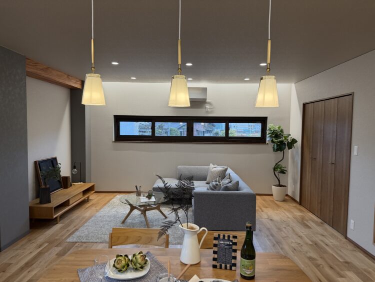 また、写真の通り、やわらかな光を落とすペンダントライトや間接照明、無垢の床材など、素材と照明計画にもこだわり、