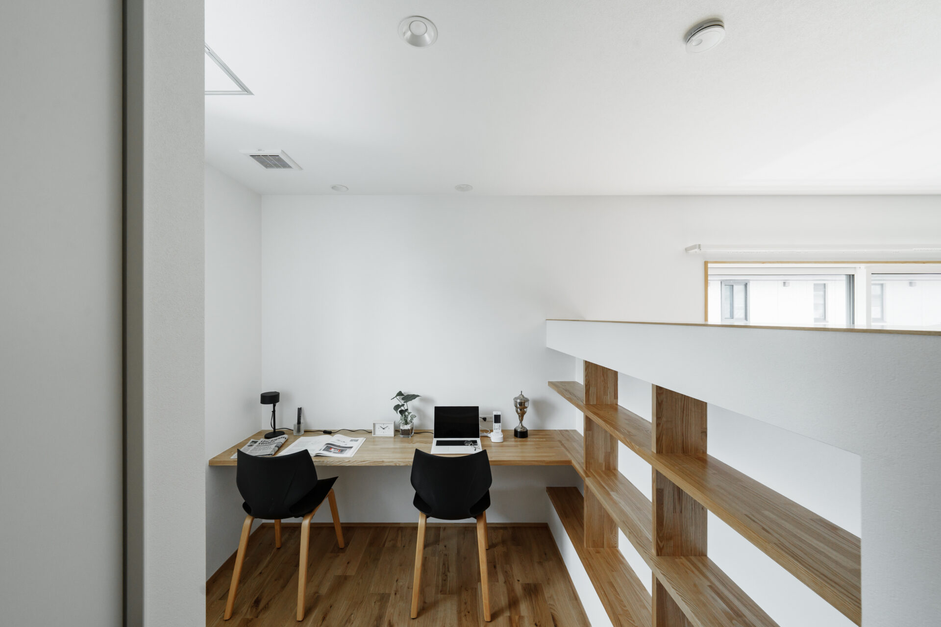 造作カウンターと棚で統一感を持たせた、すっきりとしたワークスペース。