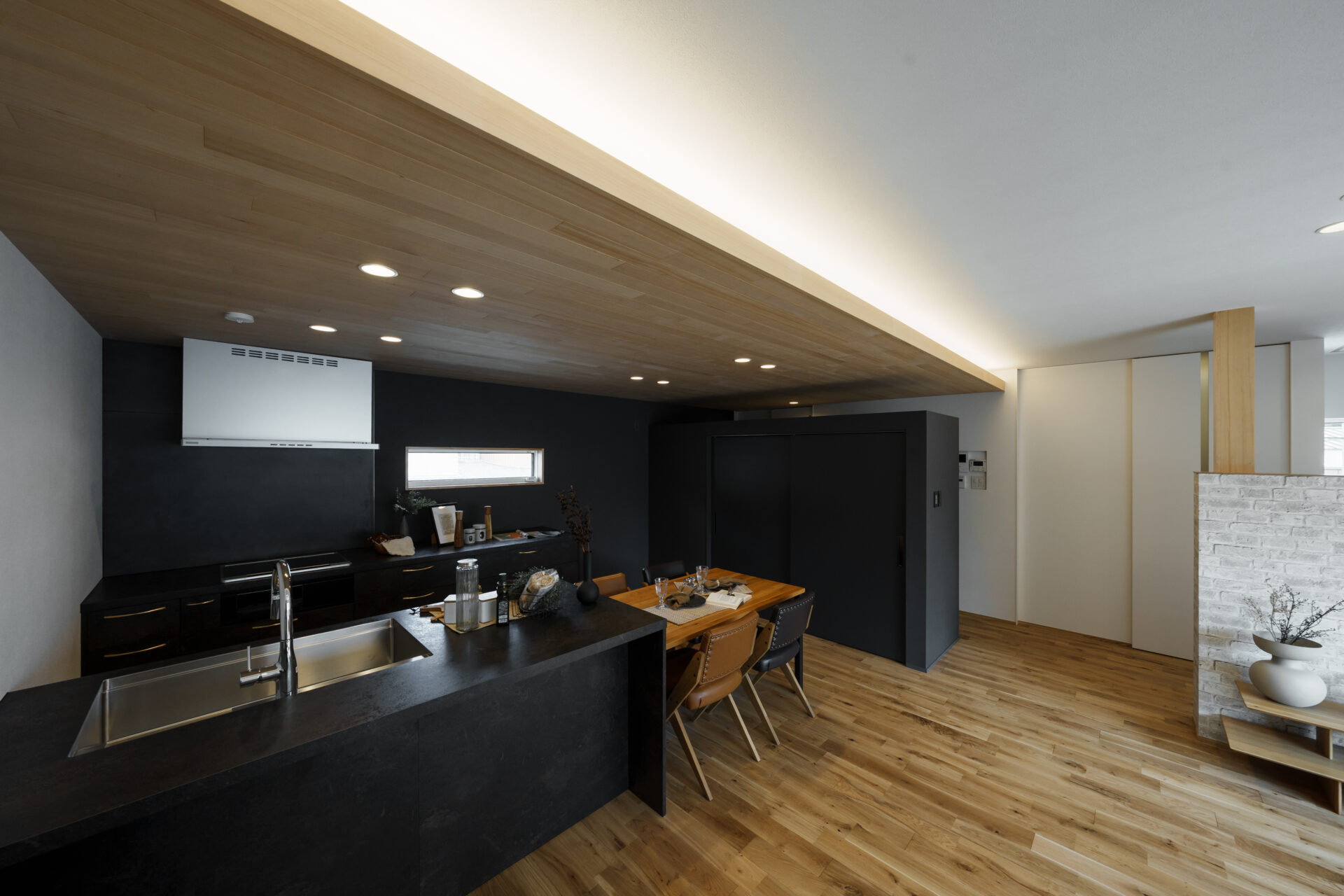 黒を基調としたキッチンが、空間全体を引き締める上質なダイニング。木の質感と調和し、落ち着いた雰囲気に仕上げています。